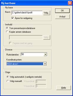 1 InnledningDenne innføringen beskriver hvordan GIS/LINE kan benyttes for å forberede kartgrunnlag og konstruere senterlinje for en enkel veg. Vi viser hvordan vegen så kan beregnes i Lima VVA og til slutt tilbakeføres i GIS/LINE med skjæring- og fyllingsutslag. Vi beskriver hvordan tilsvarende arbeidsgang kan benyttes for beregning av andre konstruksjoner som byggegrop. Vi forutsetter i denne innføringen at brukeren har GIS/LINE Kart og Lima VVA installert på datamaskinen. Det er videre en fordel om brukeren har gjennomgått GIS/LINE Grunnkurs. Vi antar at brukeren har et kartutsnitt på SOSI-format og data hentet i marken ved hjelp av totalstasjon/GPS lagret på KOF-format. 2 DatainnsamlingDigitale kart er i Norge bygget opp i henhold til SOSI standarden. I SOSI er kartdata kodet med en 4-sifret temakode pluss egenskaper som kvalitet, bygningstype osv. Når vi er ute i marken og måler er det begrenset hva vi får lagt på av egenskaper på linjer og punkt, men det som må være med er den firesifrede temakoden. Både GIS/LINE og Lima VVA forholder seg til temakoder ved import og eksport av data. 2.1 Oppretting av ny baseVi ønsker å opprette et nytt GIS/LINE prosjekt som inneholder kartutsnittet vårt. Start GIS/LINE Kart og etabler en tom base (Fil | Ny base).