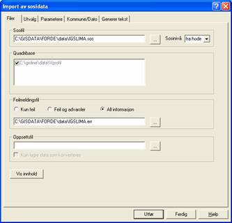 2.2 Import av kartutsnitt (SOSI)Etter at basen er opprettet velger vi import av SOSI-fil (Import/Eksport | Sosi import). Vi angir søkestien og navnet til kartutsnittet (SOSI-fil). Etter at programmet kvitterer med hva som er lest inn trykker vi knappen "Ferdig".