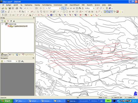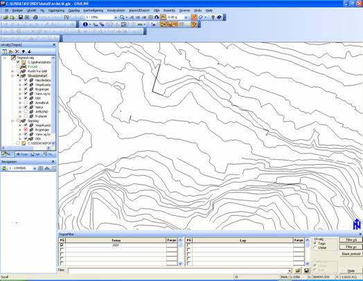 3 Oppretting av tverrprofiler til LIMA VVA3.1 Filtrering av grunnlagsdataFør vi går i gang med profilering må vi filtrere ut de data vi ønsker å profilere mot. Ofte når vi har vært ute og målt i marka, slik som i vårt eksempel her, så vil vi bare generere profiler ut fra måledata. Men i en tidlig fase av prosjektet ønsker vi gjerne å prosjektere litt i kartdata f.eks. for å finne beste plassering av vegen. Da ønsker vi gjerne å profilere på grunnlag av høydekurver, veglinjer og vannkontur. For å få dette til kan vi benytte et tegnefilter. Ved å velge Opptegning | Aktiver tegnefilter (eller tilsvarende knapp på verktøylinjen) får vi mulighet til å tegne kun de objektene som vi ønsker å profilere mot. Ved å f.eks. legge inn kun temakode 2001 (høydekurver) i Tegnefilter-vinduet og deretter aktivisere knappen "Filter på" så vil bare kotene på kartet vise.