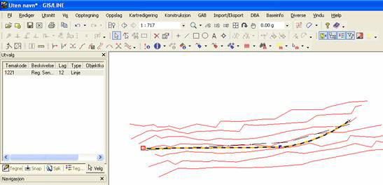 3.2 Digitalisering av senterlinjeVi vil her opprette senterlinjen for vegen (eller byggegropen, mv.) ved å digitalisere linjen i GIS/LINE, dvs. konstruere linjen ved å peke i kartet og klikke i kartet. Det er også mulig å benytte en eksisterende kurve i basen som senterlinje, f.eks. en innmålt linje importert fra KOF-fil. Vi går ikke nærmere inn på dette her. For å digitalisere senterlinjen velger vi Kartredigering | Digitaliser linje fra menyen (eller tilsvarende knapp på verktøylinjen). På spørsmål om temakode angir vi f.eks. 1221 (regulert senterlinje). Deretter er det bare å peke og klikke for å legge ut knekkpunktene til senterlinjen. Ved å høyreklikke underveis og velge Gi Radius kan man også angi buer.