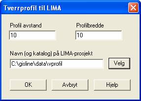 3.3 ProfileringVi vil nå lage tverrprofiler med 10 m avstand og 10 m bredde og overføre disse til Lima VVA for videre beregning. Vi velger Diverse | Profiler | Tverrprofil til LIMA - pek senterlinje | Generer fra redigeringsbase fra hovedmenyen og angir ønskede parametre samt navn og søkesti til resultatfilen i dialogboksen som kommer opp.
