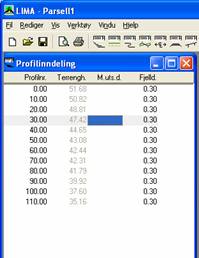 Etter vi har angitt parametre vil GIS/LINE utføre profileringen, lage nødvendige overføringsfiler, starte opp Lima VVA og oversende genererte tverrprofildata. LIMA VVA kvitterer med en melding om vellykket import av data. Under denne prosessen blir det også laget en fil på 10-tabellformat ("tiertabell") som inneholder senterlinjens horisontalkurvatur. Vi kan importere denne i Lima VVA ved å velge Fil | Import | Horisontalkurvatur. Filen ligger på angitt søkesti med angitt navn og ".tit" som etternavn, f.eks. "C:\gisline\data\vprofil.tit". 4 Beregning i Lima VVA4.1 TverrprofilGIS/LINE overfører bare data for terrengoverflaten til Lima VVA. Dersom vi ønsker å angi fjell og masseutskiftning i parsellen så kan vi legge det inn i tverrprofildata manuelt. Dette er enklest å gjøre ved å taste inn en generell verdi i hvert tverrprofil i Profilinndeling-vinduet (Vis | Profilinndeling). Dersom man f.eks. vil legge inn en gjennomsnittlig fjelldybde på alle profil så kan man angi ønsket verdi i et tverrprofil, høyreklikke og velge kommandoen Sett alle på lokalmenyen i Profilinndeling-vinduet.