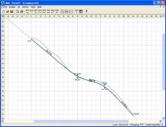 Dersom det er ønskelig med mer detaljerte data for fjell og masseutskiftning så kan det tastes inn i Tverrprofildata-vinduet (Vis | Tverrprofildata). 4.2 LengdeprofilFor å registrere vegens vertikalkurvatur åpner vi Lengdeprofil-vinduet (Vis | Lengdeprofil). Vi høyreklikker og velger Tilføy vinkelpunkt fra lokalmenyen for å skyte inn vinkelpunkt. Ved å klikke på vinkelpunkt og tangenter får vi opp gripebokser som som vi kan dra i for å flytte vinkelpunkt og angi radier. Lokalmenyen gir tilgang til flere redigeringskommandoer (se innebygd hjelp ved å trykke F1 når vinduet har fokus).