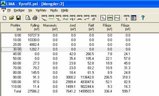 4.5 MasseberegningMasseberegning skjer automatisk når alle nødvendige data foreligger (terreng, normalprofil, vertikalkurvatur og ev. horisontalkurvatur) og det ikke er noen feil i data. Sistnevnte kan oppstå dersom Lima VVA f.eks. ikke klarer å beregne skjæring i tverrprofil. Se i så tilfelle innebygd hjelp i Lima VVA for å feilsøke og korrigere slike problemer. For å vise frem beregnede mengder velger vi Vis | Mengder.
