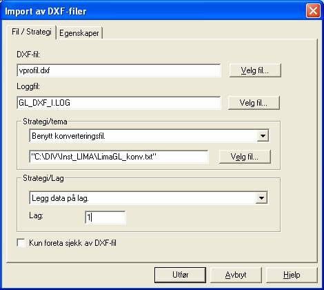 5 Tilbakeføring til GIS/LINETilbakeføring til GIS/LINE av alle linjer fra den teoretiske modellen beregnet i Lima VVA kan gjøres via Fil | Eksport | Geometri i Lima VVA. Forutsetningen er at horisontalkurvaturen (tiertabellen) som GIS/LINE genererte under profileringen er importert i Lima VVA-prosjektet (Fil | Import | Horisontalkurvatur). Tilbakeføringen skjer vanligvis via DXF-formatet og import av DXF gjøres under Import/Eksport | DXF import i GIS/LINE. Hvilke temakoder de enkelte linjene får kan enten angis under eksport i Lima VVA (se hjelp for dialogboksen, "Alternativer for eksport av geometri"), eller reguleres senere i en konverteringsfil under import i GIS/LINE.