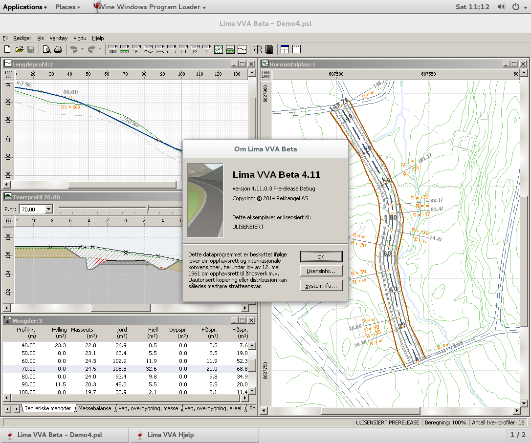 Kontakt Norkart dersom problemet ikke lar seg løse. Problemer med å få mengdeberegning (mangelfulle data)Dersom du ikke får beregnet mengder (Mengder-vinduet viser "-" istedenfor mengdetall), sjekk at alle grunnlagsdata er korrekte. Dersom "-" vises for alle profil er det mulig at horisontalkurvaturen ikke er koordinatfestet, eller at den ikke er geometrisk korrekt. Fra og med versjon 4.0 er det nødvendig å ha korrekt koordinatfestet horisontalkurvatur, eller ingen horisontalkurvatur i det hele tatt (ingen element). Gå til Horisontalkurvatur-vinduet og gjør datakontroll for å sjekke at horisontalkurvaturen er korrekt (Lokalmeny | Gjør datakontroll). Vi minner på at du kan importere horisontalkurvatur fra fil, dersom du har slike data på TIT-, DXF- eller SOSI-format (Fil | Import | Horisontalkurvatur). Alternativt kan du beregne korrekt geometri ved å bruke beregningsfunksjonen i Horisontalkurvatur-vinduet (Lokalmeny | Beregn koordinater). Se innebygd Hjelp for flere detaljer. Sjekk også andre data, deriblant parametre (hellinger, utstrekning, etc.) i normalprofilet, stigninger i terrenget og eventuelt kryssende lagskiller (godtas ikke). Feil beregning ved kryssende lagskillerLIMA vil i de fleste tilfeller gi feilmeldingen "Feil/mangelfulle data" i Tverrprofil-vinduet dersom lagskiller i terrenget krysser. I visse tilfeller kan likevel uriktig beregning bli gjort uten feilmelding, f.eks. selv om masseutskiftning krysser fjell, blir masseutskiftning beregnet til angitt dybde uten feilmelding. Kontroller derfor alle tverrprofil for kryssende lagskiller. Tverrprofil/lengdeprofil tegnes utenfor arketVed store stigninger/fall så kan det hende at tegninger går utenfor arket og/eller overskriver ramme eller tittelfelt. Problemet er at LIMA prøver å tegne alt innenfor gitt horisontalt område. Dette kan føre til stor vertikal utstrekning. Det er flere måter å løse dette på. Om mulig, du kan korrigere inndata. F.eks. dersom tverrprofilets ytterste punkt slutter i en ekstrapolert bratt stigning, legg til ekstra punkt som reduserer stigning/fall for ekstrapolert terrengskråning. Dette reduserer vertikal utstrekning av tegneområdet. Alternativt kan du endre målestokk slik at tegningen får mindre vertikal utstrekning. F.eks. i stedet for 1:200 vertikal målestokk for tverrprofil, velg 1:400, eller 1:1000. Det samme kan gjøres for bratte lengdeprofil. En annen løsning for tverrprofil er å tegne smalere kolonner. I dialogboksen for tegneoppsett, velg flere kolonner, eller sett en fast profilbredde. For lengdeprofil, så kan du oppgi kortere utstrekning (fra/til). Feil veglengde og profilnummer ved sideforskyvningVed bruk av sideforskyvning i Normalprofil-vinduet så vil pel-inndeling og profilnummer følge den opprinnelige senterlinjen (som definert i Horisontalkurvatur-vinduet). Dette er en kjent svakhet med å benytte slik sideforskyvning. Dersom du trenger pel-inndeling og profilnummer langs ny senterlinje, så må du justere den opprinnelige senterlinjen (i egnet programvare) og importere den på nytt (Fil | Import | Horisontalkurvatur). Gamle feil og problemerSe ellers gamle problemer og feil dersom du ikke har nyeste versjon av Lima VVA. |